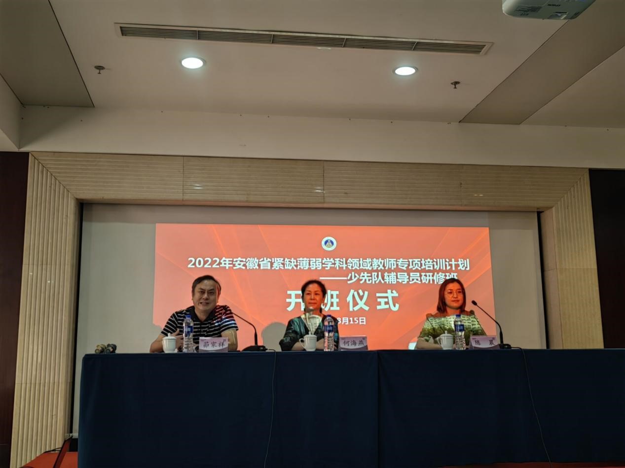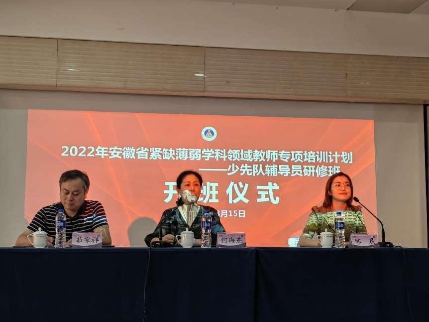 (本网讯)8月15日上午,安徽省2022年乡村学校少先队辅导员研修培训在芜湖开班,安徽金年会副院长何海燕,安徽师范大学附属小学党委副书记、安徽师范大学专业学位硕士研究生导师、项目首席专家茆家祥出席开班式,来自全省的50位学员参加开班式。