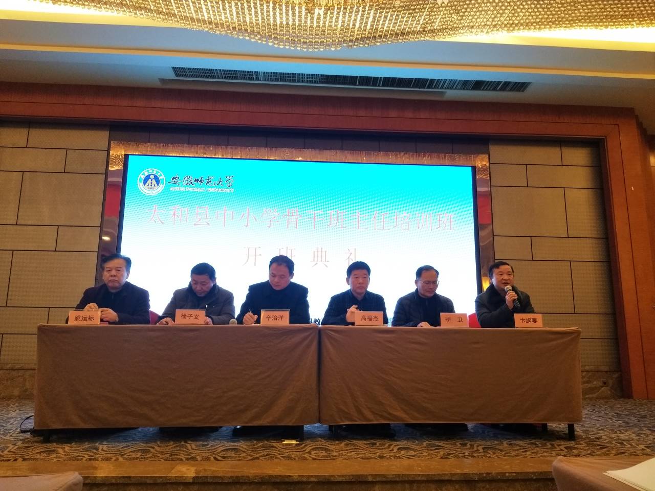 本网讯 2018级教育史专业研究生朱蓝玲 2019年12月16日上午8点,在芜湖市北尚升辉财富大酒店一楼会议中心,由太和县教育局主办、安徽金年会和安徽贝格文化培训咨询公司共同承办的太和县中小学骨干班主任培训班开班典礼在这里隆重举行。出席本次开班典礼的有安徽金年会教学副院长、博士生导师辛治洋教授,太和县教育局教育培训中心办公室主任高福杰,太和县教师进修学校督察室主任李卫,太和县教师进修学校总务处主任徐子义,安徽金年会党委委员、行政办公室主任卞纲要,本次培训班班主任、安徽金年会硕士生导师姚运标,以及参加本次培训的全体学员教师。开班典礼由安徽金年会行政办公室主任卞纲要主持。