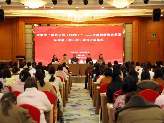兮兮露华浓 ,芸芸宾客至,何处研歌起? 冬日暖阳里。2023年12月11日, 由安徽师范大学承办的安徽省“ 国培计划(2023)”市级教师培训者团队研修项目开班典礼在芜湖市北尚升辉财富大酒店举行。来自安徽省安庆市、蚌埠市、合肥市、马鞍山等14个地级市二百名幼儿园园长、骨干教师、幼教教研员参加此次培训。安徽金年会副院长何海燕、安徽金年会副院长、博士生导师、项目首席专家张更立教授及培训班的班主任老师出席了开班典礼。开班典礼由班主任陈海燕老师主持。