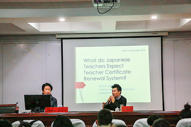 报告伊始,王路曦副教授对山田浩之教授来我院讲学表示诚挚的欢迎和感谢,并感念其研究生、博士生期间在广岛大学的求学之景。山田浩之教授从日本教师资格定期认定制度中教师的需求出发,向我们介绍了什么是教师资格定期认证制度、研究教师资格认证制度的背景、目的、方法、过程、研究对象的不同声音和研究结论。什么是教师资格认定制度?山田浩之教授向我们解释道:“日本教师资格证有效期为10年,到期需要更新。到期前的两年内需参加讲座课时30小时以上,5天(每天6小时)的讲座分为必修2天和选修3天以重新获得教师资格认定。”但由于此项制度国内外褒奖不一、教师内部态度分歧,因此教授就以广岛大学进修教师为对象做了一项研究,以问卷的形式调查教师对资格定期认定制度的态度。研究结果表明大多数教师由于时间合适选择来广岛大学进修,而真正从广岛大学学术出发、希望自己有更高的学术造诣的教师占据少数。对于以什么方式去学习,研究结果显示必修课中80%的老师希望采用老师教、学生听的方式,而在选修课中较多的进修教师希望采用小组讨论的形式进行教学。在课程内容方面,进修教师更希望学习一些提升教育能力、短期内有明显效果的课程。对于是否支持此项制度继续执行,教师之间存在不同的声音,研究结果表明此项制度在一定程度上可以提升教师的教育教学能力,但有必要改革教师资格定期认定制度以减轻教师的负担及经济压力。