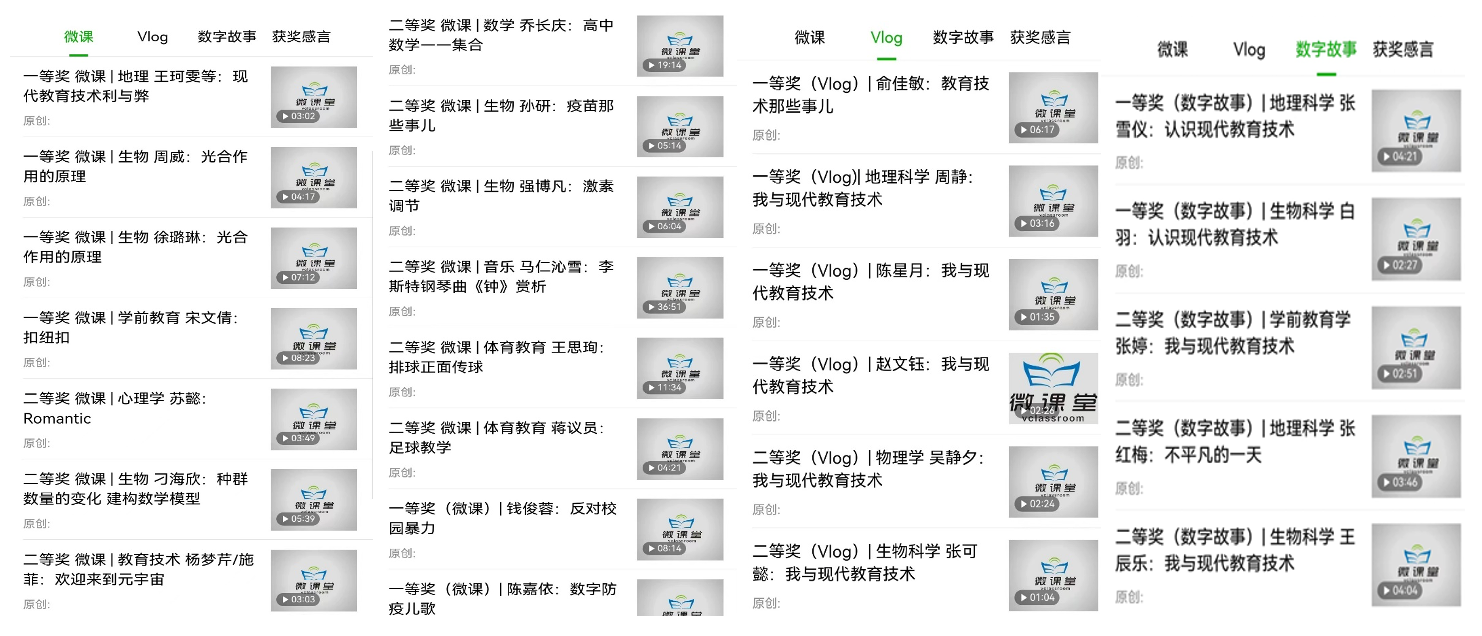 第二届大赛自征集以来,得益于校院两级大力支持,依托教师教育类《现代教育技术应用》课程平台,依靠课程团队教师的辛苦付出,本次比赛共有全校生命科学学院、地理与旅游学院、历史学院、物理与电子信息学院、体育学院、教育科学学院等11个学院、14个专业、28个班级、超过1990人次共同参与,据不完全统计,本届大赛比第一届大赛参与人数净增640余人,在全校师范生的踊跃参与下,共提交微课、数字故事、vlog等作品111件,可谓全员参与、佳作纷呈。经过激烈角逐共99份作品获奖,其中一等奖10项,二等奖14项,三等奖17项,优秀奖58项。部分获奖作品已通过教育技术学官微“教育技术微课堂”公众号进行展播。