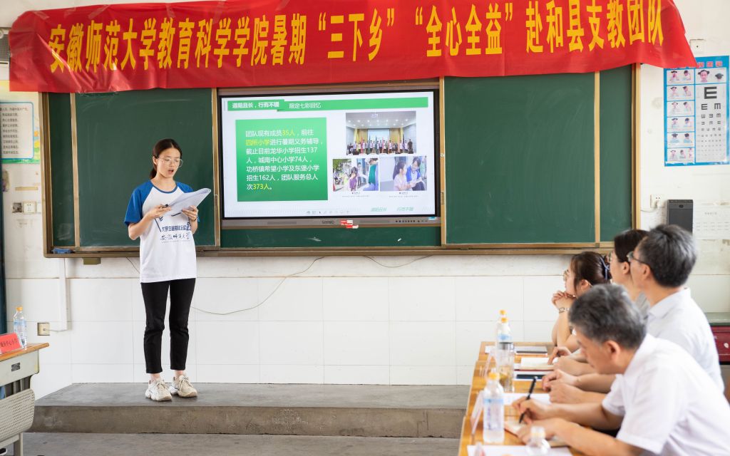 “暑期社会实践对我们有很好的启示,思政课该怎么上?一定要走出校门!一定要社会实践!一定要到人民群众中去。”陆林强调暑期社会实践是大学生的一堂特别的思政课,要将社会实践与求职择业相联系,通过暑期社会实践为今后就业做好铺垫与准备,希望同学们做到理论与实践的紧密结合,努力提升自己的专业能力。陆林希望支教团队的教学课程设置要积极与专业教师交流学习,要听取当地学员及家长的反馈,在实践过程中全面提升自身的综合素质。陆林最后向和县政府给予的支持和关心表示感谢,希望今后能在更多领域结对共建。