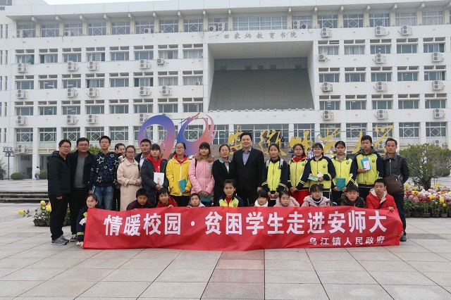 本网讯(教科院 高凡 张亚楠)为了进一步推动贫困家庭学生关爱帮扶工作的开展,加强对贫困家庭学生的心理关怀和精神成长引导,11月21日,和县乌江镇人民政府、县青年志愿者协会与我院联合开展“情暖校园,贫困学生走进安师大”活动。乌江镇部分建档立卡家庭的初中生到我校进行一天的学习和生活体验,感受师大的人文风采。随同学们一同前来的还有乌江镇党委副书记秦勇、乌江镇政府宣传室副主任余华兵乌江镇政府计生办办事员葛静树、乌江中学政教处主任何庭、卜集中学团委书记刘静婷、卜陈中学学生辅导员赵龙华、和县青年志愿者协会秘书长马宁。