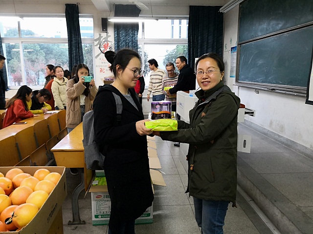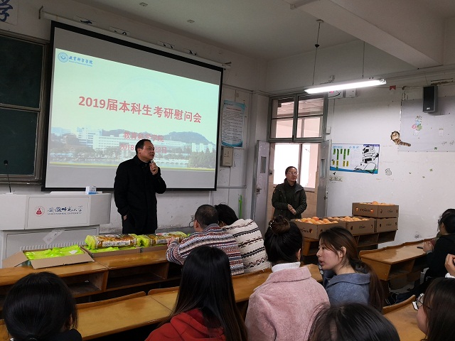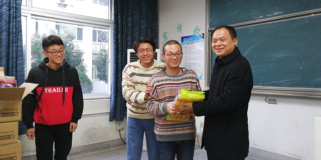 随后,学院领导老师们与考研学子在学习、生活等方面进行亲切交流,给同学们发放了面包、水果等慰问品,现场其乐融融。张如华代表学院向考研同学承诺:“学院会全力做好后勤服务工作,考研接送包车已早早联系妥当,同学们可以放心备战,预祝大家考试顺利!”