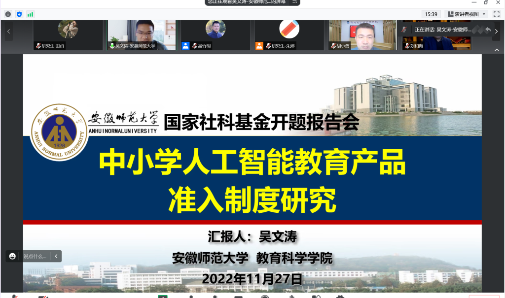 20221127日上午,国家社科基金2022年度课题开题报告会如期举办,由于疫情防控需要,本次开题报告会采用线上形式进行。此次开题的是吴文涛副教授主持的国家社科基金青年项目“中小学人工智能教育产品准入制度研究”( 课题编号22CGL045)。学院特邀华中师范大学人工智能学部副部长、国家数字化学习工程技术研究中心常务副主任刘三女牙教授,西北师范大学教育技术学院院长郭炯教授,华南师范大学教育人工智能研究院常务副院长胡小勇教授,教育部教育技术与资源发展中心研究员宋灵青,安徽师范大学刘和海教授组成评议专家组,科大讯飞教育技术研究院副院长王亚飞,课题组成员杨滨教授、白倩副教授、吴钦金老师以及学院部分师生参加了开题报告会。开题报告会由校网络安全与信息化办公室副主任聂竹明教授主持。