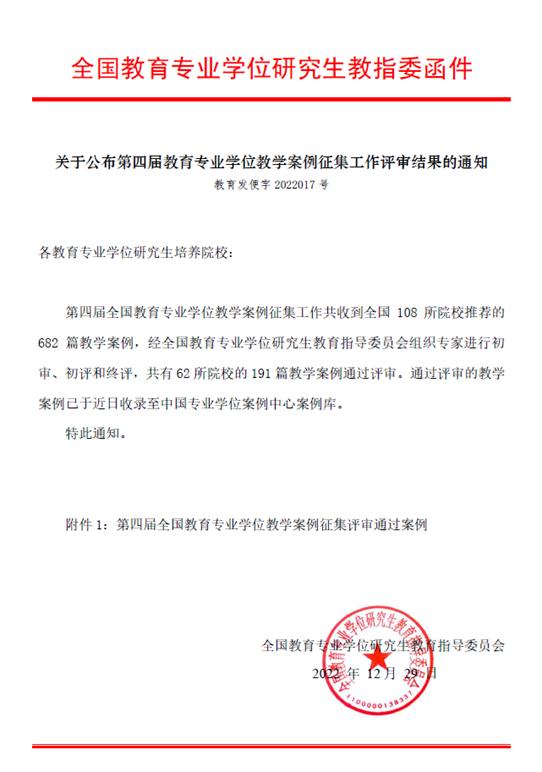 近日,第四届全国教育专业学位教学案例征集工作评审结果公布,在校研究生院指导下,挂靠在教育科学学院的安徽省教育专业学位案例库和教学案例推广中心推荐的7篇优秀教学案例成功入选中国专业学位案例中心案例库,案例入库数在62所参评高校中排名第二,在全国教育硕士培养单位中名列前茅。