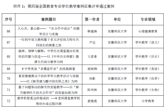 自接到教学案例评选征集通知以来,校研究生院指导安徽省教育专业学位案例库和教学案例推广中心广泛动员,积极准备,精心选拔,中心主任阮成武教授高度重视本次教学案例评选征集工作,带领中心团队成员全程指导。全校教育硕士各领域(方向)踊跃参与、积极提交案例作品,安徽省教育专业学位案例库和教学案例推广中心在众多教学案例中评选推荐出10篇优秀教学案例。后续完善过程中,被推荐的教学案例结合专业特征和教学实践经验对案例细心修改、反复打磨,并提交至全国教育专业学位教学指导委员会评审,最终我校小学教育、心理健康教育、学科教学(语文)、学科教学(历史)、学科教学(英语)、学科教学(化学)、学科教学(生物)等7个方向的7篇佳作从众多参选案例中脱颖而出,成功入选中国专业学位案例中心案例库。