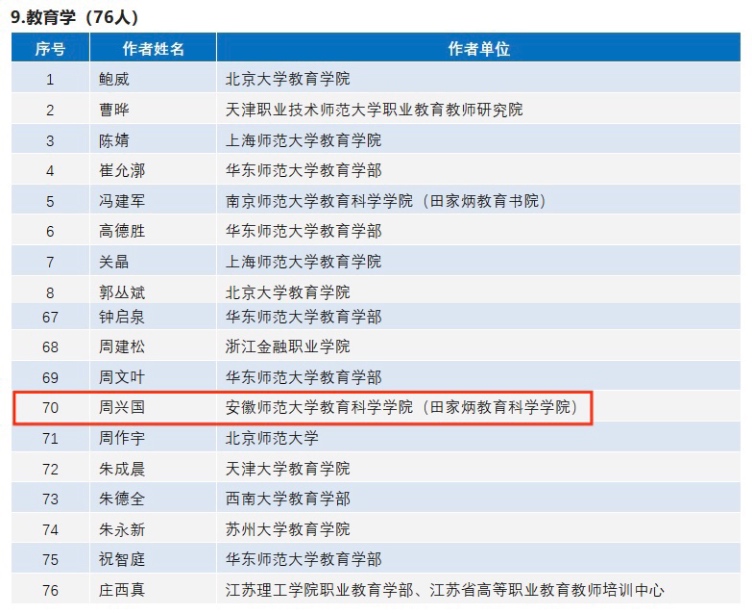 近日,中国人民大学社会科学学术成果评价研究中心联合中国人民大学书报资料中心发布《复印报刊资料重要转载来源作者(2022版)》拟入选名单,各学科总计入选作者852位。教育学有76位,其中我院周兴国教授入选。