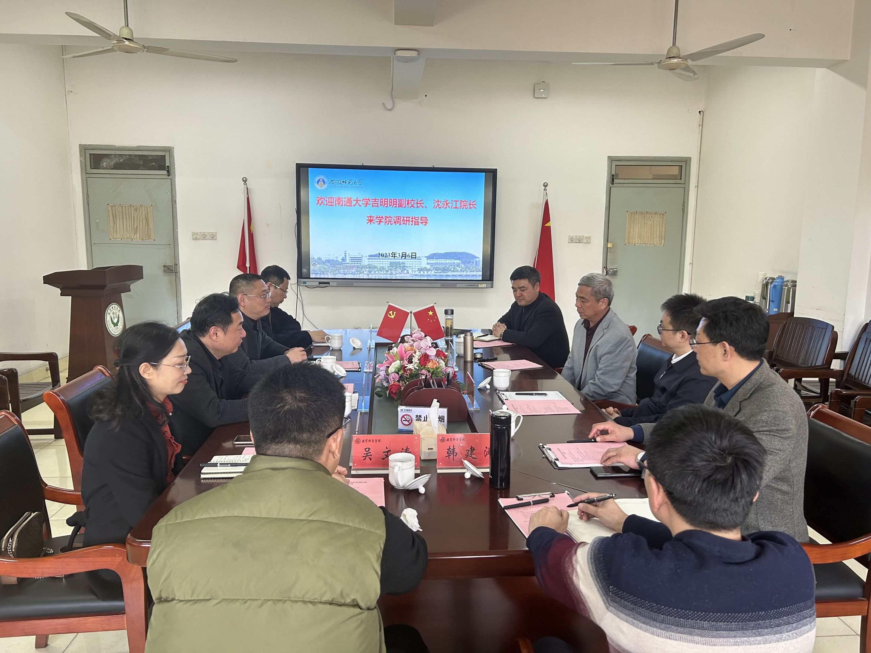 3月6日下午,南通大学党委常委、副校长吉明明、南通大学教育科学学院院长沈永江、南通大学教育科学学院教授李红美、南通大学教育科学学院实验中心主任张嘉楠等一行来教科院调研指导,就博士生导师聘任和学科发展进行座谈。校党委常委、副校长熊宇杰、校党委常委、副校长、教育学一级学科负责人朱家存、校研究生院院长桑青松、教育科学学院院长李宜江、教育科学学院副院长韩建涛、教育科学学院副院长吴文涛等参加此次会议,会议由校研究生院院长桑青松主持。