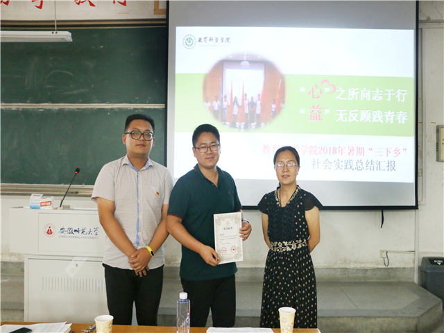 本网讯(教科院 徐翔)青年大学习,奋斗新时代。为检验我院2018年暑期社会实践成果, 919日下午在田楼8102教室召开2018年暑期“三下乡”社会实践总结汇报会。出席本次活动的有院党委副书记张如华、和县青年志愿者协会副会长马宁、心理学专业负责人王道阳、教育技术学专业教师陶佳、院团委副书记莫大贡、2017级辅导员谭茹轩。