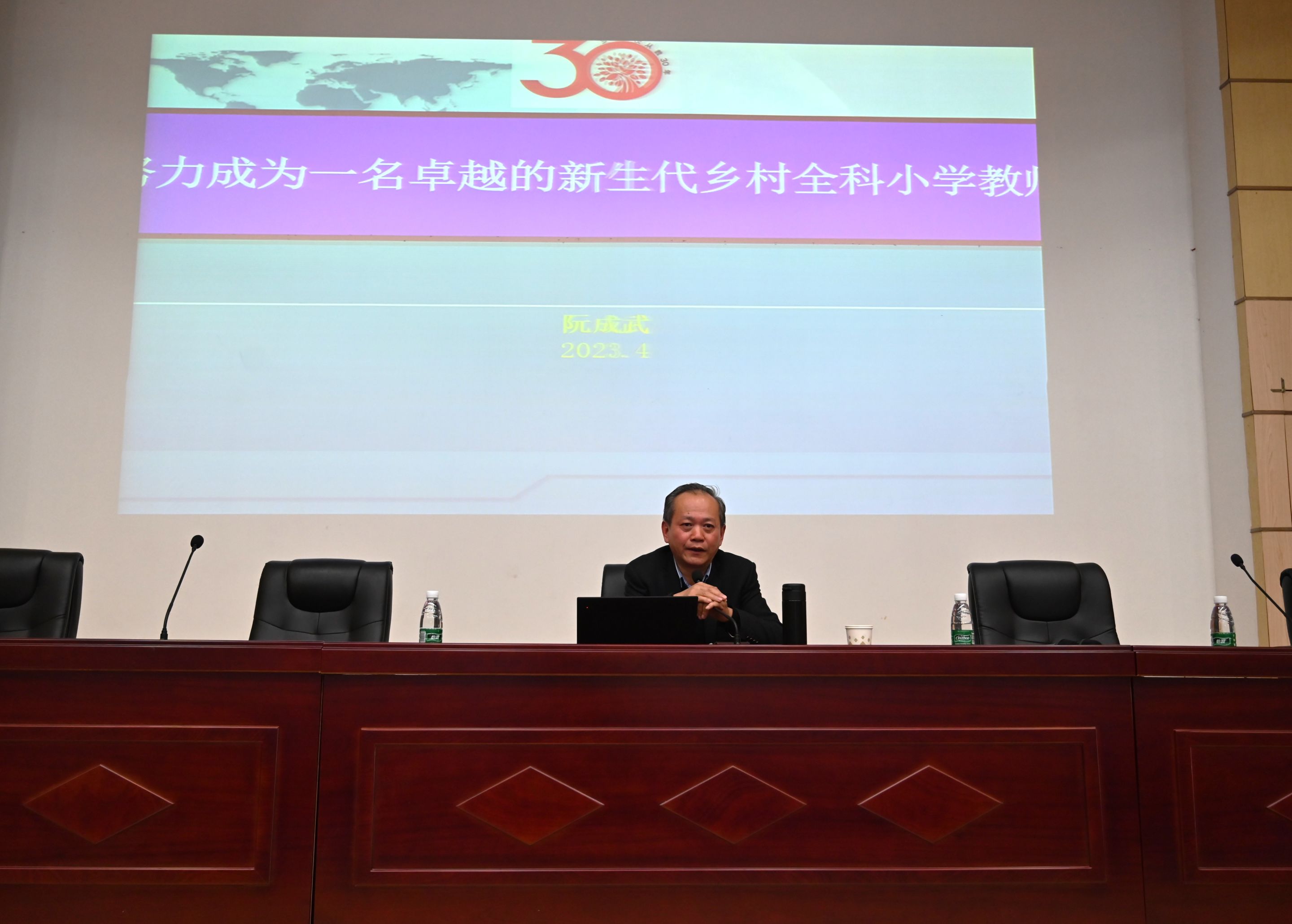 最后,阮老师就“如何做好一名新生代乡村教师”向同学们提出要求。他谈到,作为一名新生代乡村教师,要形成乡村教师的核心素养。克服依赖思想,积极进取,形成全科教师的知识和能力结构,不仅要胜任乡村学校需要,也要面向未来,能够胜任城镇学校的需要,甚至要为更长远的职业规划做准备。新生代乡村教师要具备更多的爱心和同情心。面对乡村学校多留守儿童的实际情况,用一颗心去温暖另一颗心,给学生更多的爱与同情,向杨瑞清、秦李等优秀教师学习,扎根乡村教育,充满教育梦想和情怀。新生代乡村教师要具有全科和多科教学能力。陶行知先生的“知行合一”告诉我们,全科教师的能力是“干”出来的。因此,只有多学一些,才能够多一些走进学生心里的渠道。新生代乡村教师既要有现代观念和生活方式,又具有乡土情怀和本土意识。能够融入乡村生活和民众,成为当地的新乡贤;能够具有本土知识和情怀,开发本土特色的校本课程。新生代乡村教师应具有强大的内心世界和良好的心理素质。能够耐得住寂寞,坚持自己的价值观,有自己的主见和理想。能够与外部世界同步互动,积极看待生活,乐观热情,具有长远的职业规划和人生追求。“小学教师可以成就大事业!在‘小’字上可以作出‘大文章’!让乡村小学教师成为时代赞誉的‘大先生’!”这是阮老师最后送给小学教育全体同学的期望和祝愿。