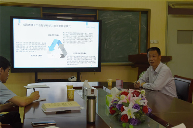 本网讯( 许文齐/文 苗艳侠/图)2018年6月1日下午4点,中国科技大学教授、安徽信息工程学院院长吴敏应邀来我院做一场题为“基于校园网的个性化学习”的学术报告,报告在我院408会议室举行,张新明教授、刘和海副教授、王清副教授、许之民副教授、叶方舟老师及部分教育技术学专业研究生到场聆听。