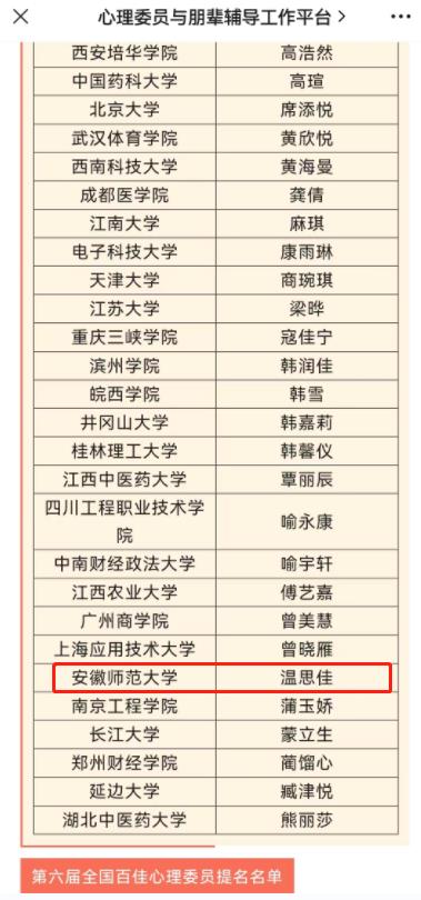 近日,第十八届全国高校心理委员工作研讨会暨朋辈心理辅导论坛在中南财经政法大学举办。来自全国200多所高校的344名优秀心理委员参与评选“全国百佳心理委员”,经中国心理学会心理危机干预工作委员会、全国高校心理委员研究协作相关专家审阅确定,我院20级教育技术学温思佳同学获评此殊荣!