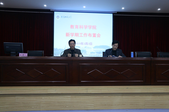 最后,桑青松院长从年度考核情况、学院2017年度津贴分配整体情况、科研课题申报和结项工作开展情况等12个方面对寒假期间学院开展的各项工作进行了回顾。从加强党建与思想政治工作、注重师德师风建设、构建科学的创新型人才培养模式、加强教育科学研究工作、充实学科内涵,提升学科核心竞争力、加强学院制度建设等6个方面对2018年学院工作进行了布置。桑青松指出,2018年是学校建校90周年,是学院“十三五”规划实施的关键一年。2018年,学院将继续实施以育人育才为中心的整体发展战略,构筑学生、学术、学科一体的综合发展体系。他强调,2018年注定是不平凡的一年,是贯彻党的十九大精神的开局之年,我们还将迎来改革开放40周年,做好改革工作意义重大。改革如逆水行舟,不进则退。学院发展同样如此。全面深化教育改革的航船行进至今,面向未来,学院怎样继续高扬风帆、加速前进?学院又靠什么劈波斩浪、攻坚克难?唯有解放思想!!因为思想是总开关、总闸门,没有思想上的破冰,就难言行动上的突围。他希望全院上下,恪守办院、治学、从教的核心价值观,树立“学生至上”、“人才至上”的核心理念,以时不我待只争朝夕的精神投入工作,努力开创学院事业发展的新局面。会上,还对近期学院工作进行了安排。