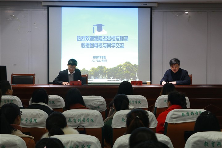 (教科院 文/孙岩松 图/许文齐)2017年12月2日上午,我校杰出校友、华东师范大学教育学部博士生导师、全国教育基本理论学术委员会秘书长程亮教授在我院三楼学术报告厅为教育科学学院部分老师、本科生以及研究生做了一场题为《在师大,做教育---我的研究经历与心得》的学术交流会,报告由我院李宜江教授主持。