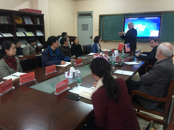 会上,布莱诺大学校长Edward Schrader 首先向大家介绍了他们的新任教务处长Jim Eck,他指出Eck在对外合作办学及高等教育方面有很丰富的实践经验,将会全权负责协助中美学前的学生在美学习事务。同时,他欣喜地介绍了第一批中美学前的同学在美学习的收获与成长,对于中方输送的优秀学生表示赞赏,在与第一批赴布莱诺大学学习的学院学生交往中,他们对后续的培养方案及学生指导做了相应的调整,将会力求为教科院学生在布莱诺的学习创造一个良好的环境。交流期间,Edward Schrader校长还与学生就在美学习的专业选修、学习旅行、饮食住宿包括人身安全问题进行了亲切交流。