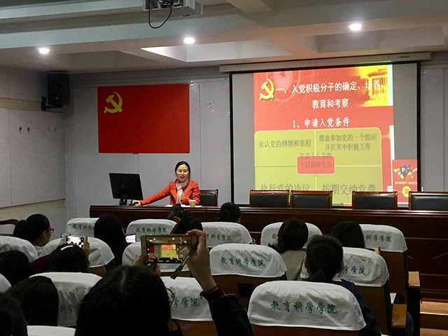 她向学员们介绍了我院严把“入口关”,在发展党员流程中的创新之处。在解读过程中,张如华着重强调了从入党申请到最后成为正式党员主要阶段的时间要求,提醒大家要注意包括入党申请书在内的多项发展党员工作文书表格的具体要求与填写规范。她勉励全体学员应该把进入党组织作为奋斗目标,在奋斗的过程中不断地进行自我尝试、自我提高和自我完善,永远将政治标准放在首位,并通过自己的不懈努力达成目标。