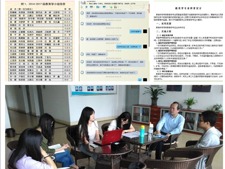 教育学专业从建设之初就注重集体研讨和顶层设计。200913日下午,春寒料峭,教科院三楼会议室内却热闹非凡,学校时任校长王伦教授出席国家级特色专业(教育学专业)建设方案工作会议时要求:一要有组织良好的机构、运行机制和制度,二要有重要环节和负责人,三要建设出特色。在王校长的指导下,朱家存教授每年都要主持专业建设研讨会,研判教育学建设与发展中的实际问题,做出年度任务安排和人员分配,全面服务学生的成人、成才和成功。