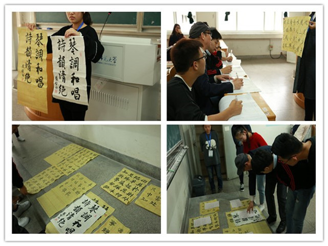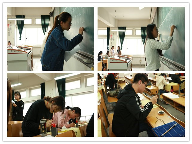 大赛伊始,主持人宣读了大赛流程及相关规定,工作人员为参赛选手分发比赛用纸。大赛采用分组比赛制,选手按编号依次上台进行抽签决定粉笔字书写篇目,其余参赛选手进行规定篇目钢笔字书写和自选篇目毛笔字书写。大赛进行过程中,台上的选手一撇一捺写得苍劲有力,台下的选手专心致志,尽情挥洒书生意气,创造出一篇篇凝聚了中华传统书法文化的优秀作品