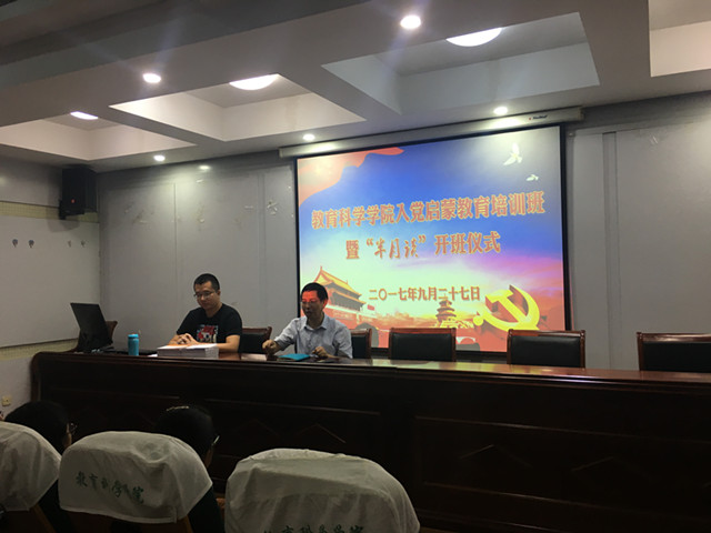 本网讯(教科院 郭俊俏 龚伟)大学新生入学为高校增添新的生机与活力、为学生党员队伍注入新鲜血液,大学新生如何在入党过程中真正做到思想和行动同入党,教科院以“半月谈”为重要载体,结合高校党建要求、新媒体发展态势、大学生特色需求,创新开办入党启蒙教育培训班。927日晚,开班仪式在学院三楼学术交流中心顺利举行。院党委书记刘晓宇、本科生学前教育专业党支部书记龚伟、2017级辅导员谭茹轩出席了本次开班典礼。参加本次大会的还有学院3位研究生驻班党员以及2017级学前教育专业本科生。