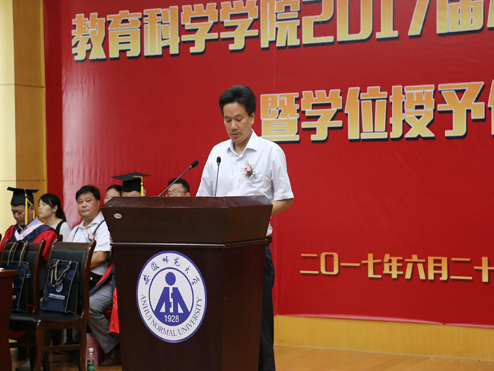 本网讯(教科院 马兴)为谁盛放花满路,教科心如故。纵使时间匆匆,也想为毕业生留下最美好的回忆。6月24日下午,教育科学学院2017届本科生毕业典礼暨学位授予仪式在田家炳教育书院报告厅隆重举行。校党委常委副校长毕明福、教科院实习基地代表、安徽省教师教育协同创新试实验区代表、院友代表、毕业生家长代表、学院党政领导、教授委员会全体成员、各专业负责人、学院教师、各科室秘书等共同为学院178名本科毕业生送别。典礼由学院党委书记刘晓宇主持。