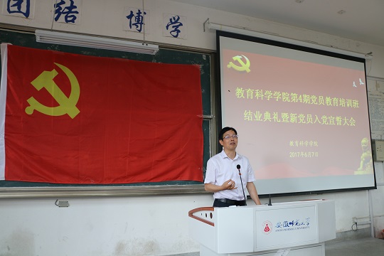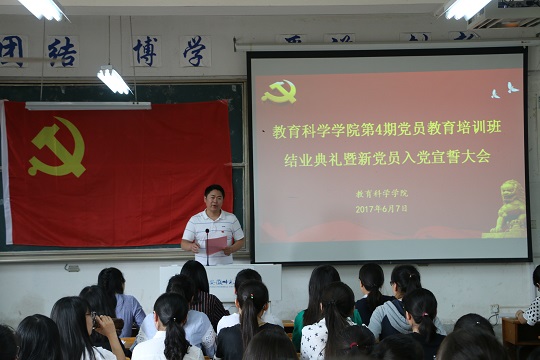 本网讯(文/教科院 裴扬 图/范晨晨)2017年6月7日下午,院第4期学生党员培训班结业典礼暨新党员入党宣誓大会在田家炳教育书院8101教室举行。院党委书记刘晓宇、副书记张如华、党委秘书马兴、党课班副班主任随小莉以及党课班全体学员、本期发展的预备党员和转正的党员参加了会议。会议由党课班班主任莫大贡主持。