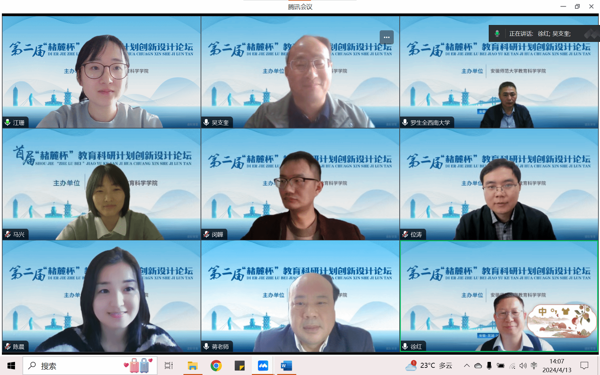 2024年4月13日-14日,教育科学学院第二届“赭麓杯”教育科研计划创新设计论坛如期举行。学院特邀南京大学陈友华,北京师范大学马健生,华东师范大学刘俊升,华中师范大学任志洪,西南大学徐辉、罗生全,南京师范大学沈书生,西北师范大学郭炯,广西师范大学蒋士会等知名专家线上指导。