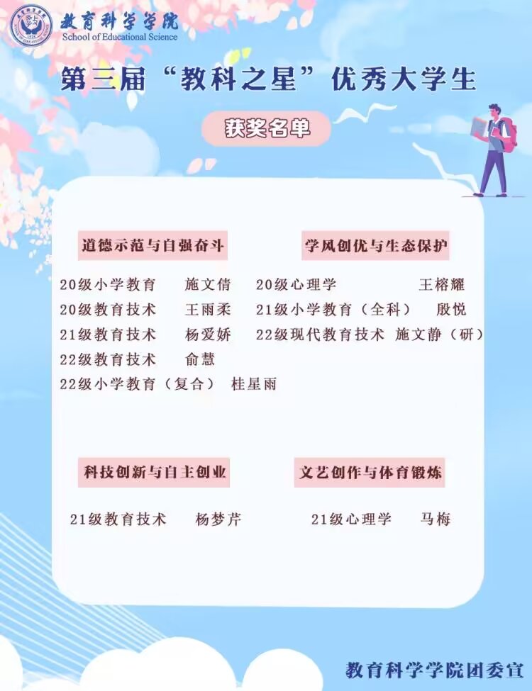 时代殷殷嘱托,青年砥砺前行。“教科之星”十佳大学生评选是学院为教科学子搭建的分享交流平台,秉持树立先进模范、发挥榜样引领作用的理念,旨在促进学生的全面发展。希望更多的教科学子向榜样学习,用奋斗书写青春的精彩篇章。