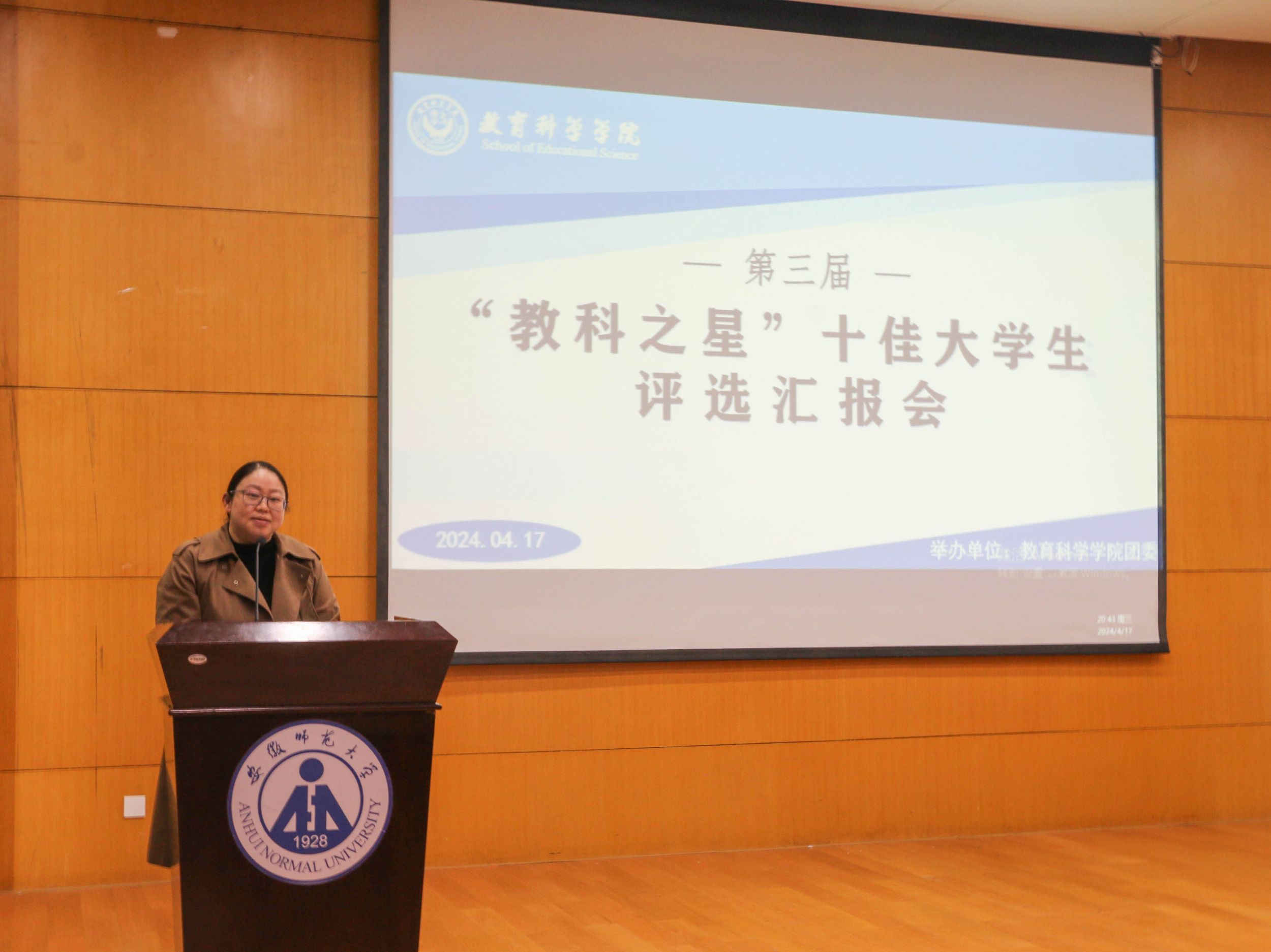 为落实大学生护航行动计划,发挥青年先进典型模范引领作用,树立自强、勤奋、进取、创新的榜样,引领教科学子争做时代青年。4月17日晚,教育科学学院于赭山校区田楼报告厅举办第三届“教科之星”十佳大学生评选汇报会。院党委副书记杜凤、小学教育全科型专业负责人王芳、教育学专业负责人徐赟、小学教育复合型专业负责人杨俊铨、院团委书记付银行、各年级辅导员出席活动并担任评委,各年级学生代表现场观摩。