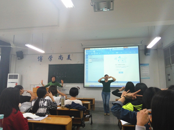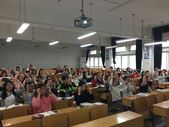 在杨老师的引导下,一首以按摩为主题的韵律活动设计中,我们相互打节拍,为同小组的同学“按摩”,同学们沉静于旋律之中。而在此之后的示范环节,伴随欢快、活泼的旋律《Trouble is a Friend》,两位老师为我们带来了一场精彩的音乐舞蹈表演。兔子舞蹈的出现更是让课堂氛围达到了高潮,同学们与两位老师一起舞动起来,仿佛回到了无拘无束的童年时光,一些同学更是自告奋勇走上前台,参与到兔子游戏活动之中。