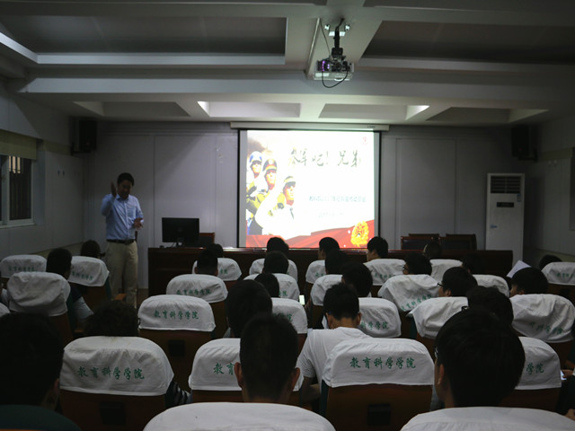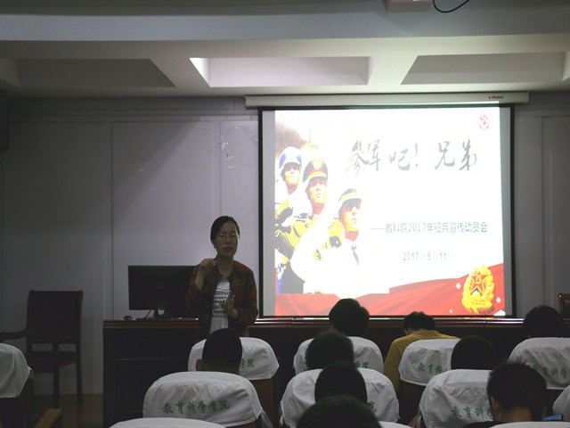 本网讯 教科院 张启山 朱雨雁男儿何不带吴钩,收取关山五十州。为响应国家号召,加强征兵政策宣传,教科院于5月11日中午举行了2017年征兵宣传动员会,16级全体男生参加了此次动员。本次动员会由2015级辅导员莫大贡老师主持。