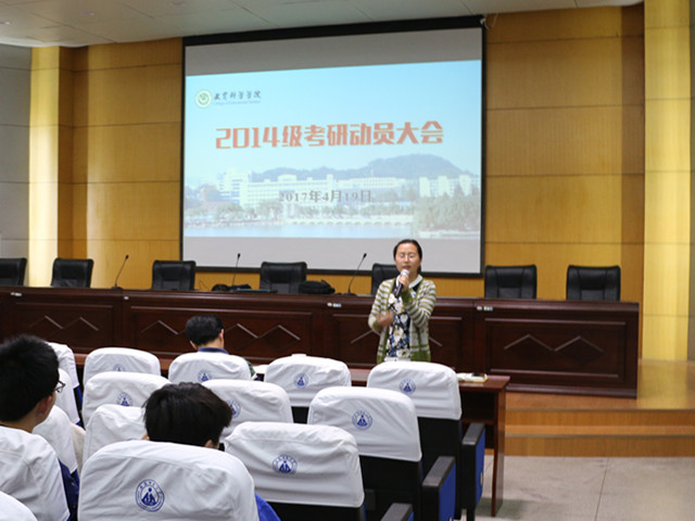 桑院长随后对2017届考研取得的优异成绩表示了祝贺,同时对2014级学生积极准备考研的行动予以了称赞。通过结合我院知名校友与经典教育名言,桑院长强调要认真对待考研并积极争取机会,他希望同学们能够做到有决心、恒心和平常心,面对国家发展需要、社会发展的需要和自我发展需要,同学们应该尽早做好自我定位,尽快确立学习规划,投入到紧张而充实的考研中去。