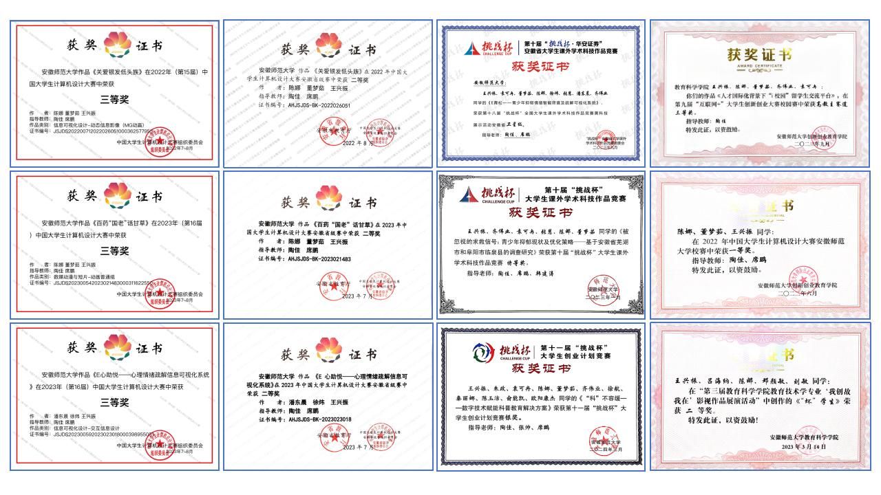 王兴振深知所学的专业知识必须通过不断地实践才能真正转化为自身的能力和素养,因此他积极参加各类学科竞赛活动。大二期间,他获得了2022年(第15届)中国大学生计算机设计大赛国家级三等奖。大三至大四学年间,他再接再厉,获得了2023年(第16届)中国大学生计算机设计大赛数媒动漫与短片组国家级三等奖和信息可视化设计组国家级三等奖2项国家级奖项。此外,他积极参加“挑战杯”“互联网+”等学科竞赛,获得第十八届“挑战杯”全国大学生课外学术科技作品竞赛黑科技展示活动安徽省卫星级奖项、第十届“挑战杯”大学生课外学术科技作品竞赛校级特等奖、第十一届“挑战杯”大学生创业计划竞赛校级银奖、安徽省百所高校百万大学生科普创意创新大赛校级二等奖、第九届“互联网+”大学生创新创业大赛校级三等奖等多项奖项。