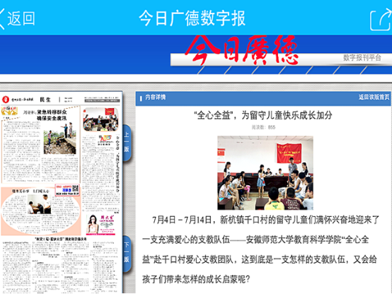 为进一步扩大社会实践的影响力,加大社会对于留守儿童这个特殊群体的关注,小队积极利用当代媒体,专人管理,线上线下,齐头并进。微博、微信与QQ三方宣传,不断更新团队实践进度,短短十天引起各方关注。广德数字报主动对小队进行了采访,并迅速整理相关资料,登上报纸页面,扩大小队实践活动的影响力。如落石击湖,小队成员们持久的努力引起各方关注,用青春谱写了一首生命的礼赞。