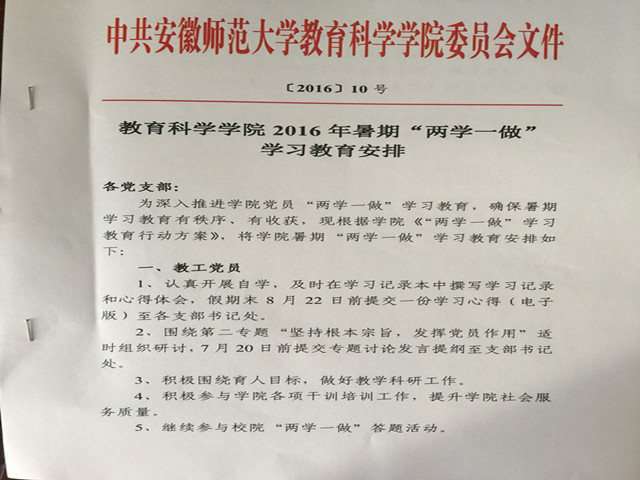本网讯(教科院 马兴)为深入推进学院党员“两学一做”学习教育,确保暑期学习教育不断线、不断档,学院在总结前期“两学一做”学习教育开展的相关工作基础上,对暑期“两学一做”进行了精心规划,制订了《教育科学学院2016年暑期“两学一做”学习教育安排》计划,提出了暑期学习教育“123”行动计划。