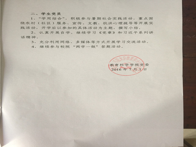 “123”行动计划旨在强化党员的学习实践意识,提升学习教育效果。所谓“1”即坚持一颗学习之心不动摇,“两学一做”基础在学,学习是首要任务,学院要求全体师生党员继续认真开展自学,并及时在学习教育笔记本中撰写学习记录和心得体会。“2”即继续依托两个网络平台(微信群平台和学院微信公众号),开展“百日党章人人读”、“百日千题人人答”活动,提升学习教育效果。“3”即3份学习成果,一是结合学习,假期中师生党员至少提交2500字的学习心得;二是围绕第二专题“坚持根本宗旨,发挥党员作用”适时组织研讨并提交发言提纲;三是一份实践报告,号召学生党员积极参与暑期社会实践活动,重点围绕农村(社区)服务、宣传、支教、抗洪心理疏导等开展实践活动,并撰写实践报告。