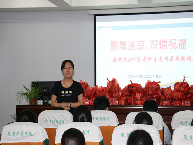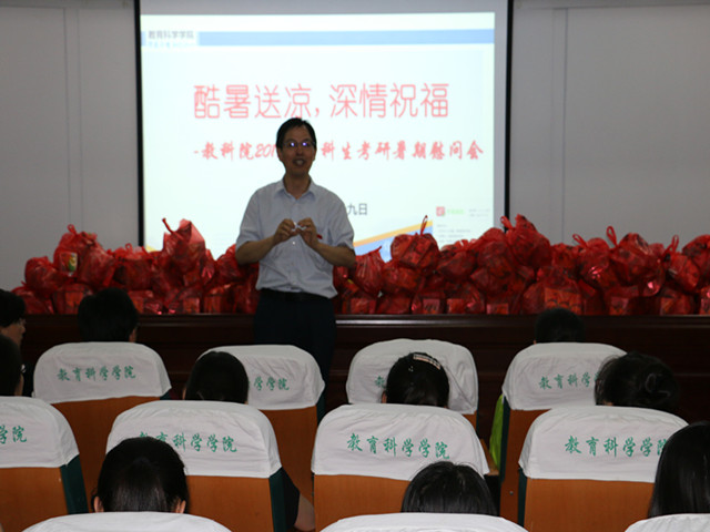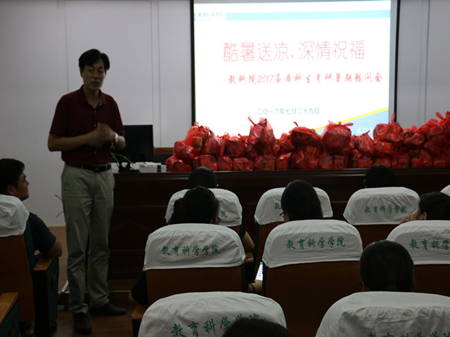 本网讯(教科院 马兴)炎炎夏日酷暑难耐,考研学子学习不懈怠。为助力学生更好地复习迎考,为他们加油添劲,7月29日下午,教育科学学院在学院三楼学术报告厅举行了2017届本科生考研暑期慰问会。学院党委书记刘晓宇、院长桑青松、副院长李宜江、副院长何海燕参加了此次会议。大会由院党委副书记张如华主持。