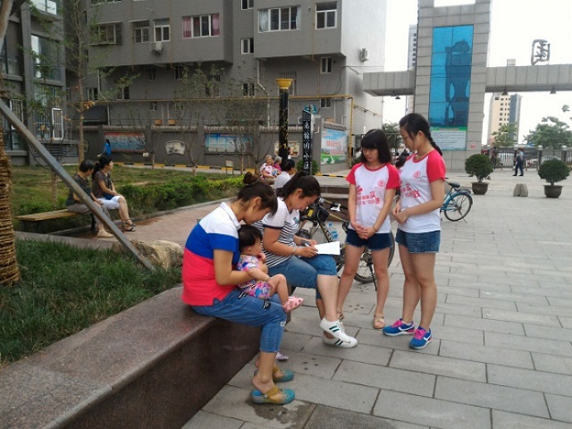 从活动开始的每天傍晚,所有队员都前往了小区或公园。我们的第一站是留芳公园,活动过程中出现了很多问题,其中最多的问题就是民众的配合,我们立刻采取了应急措施,首先减少了我们的题目量。问卷题量原是按照标准的问卷改编的,题量较多,我们尽力减少到30题但是还是有民众觉得题量多,所以我们就买了一些小礼品,作为问卷的附送,采取了这些措施后,问卷收回率大大提升。相对于公园,小区的调查困难更大。由于我们的统一着装,有许多小区门卫都认为我们是发传单的,这给我们的工作带来了很大的困难,我们必须要花费很大的精力来和门卫解释我们的目的,但是仍然很多次被拒之门外。相比于这两类场所,我们在夕阳红养老院的社会调研活动就显得格外轻松了,在每天的例行活动后,我们都会一些工作人员填写问卷。