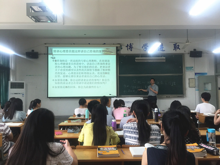 此次公开课教学内容是“学校心理健康教育的伦理”,何老师首先通过一个案例引发大家的讨论:某咨询师在专业培训中为了吸引听众的注意,公开了某来访者在恋爱过程中的很多具体感受,这种行为是否妥当?通过大家的讨论,何老师顺势总结出学校心理健康教育工作者在教学或者科研发表中,如果需要引用来访者的案例,应当遵循的伦理原则。如此吸引了大家的强烈兴趣,深刻认识到伦理问题的现实意义。接下来,何老师又从学校心理健康教育伦理的涵义、现状、意义、内容等方面进行阐述,让大家对这一主题有了全面的认识。何老师反复强调大家要注意应该做什么和不应该做什么,谨遵各项伦理原则,尤其要牢牢树立对当事人的“无伤害”原则。何老师从事高校学校心理健康教育工作十余年,作为教师和咨询师具有扎实的学术功底和丰富的实践经验,在讲述伦理问题时处处流露出对来访者的关爱、尊重和保护之情,让聆听公开课的师生深受感动。公开课结束后,校督导团和部分听课教师对何老师在教学设计、课堂组织等方面予以充分肯定,并提出了一些宝贵的建议。