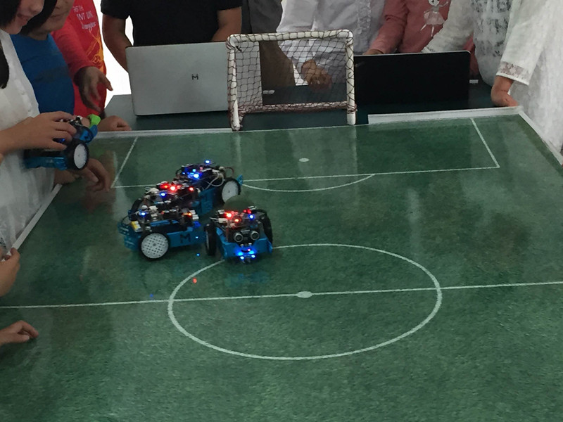 观摩体验课程,首先由来自科普产品国家地方联合工程研究中心合肥总公司的创客指导老师给参加创客课程的同学们讲解足球小车机器人的构造与拼接方法并示范拼接过程,之后孩子们自己动手拼接了属于自己的足球小车,不到一节课的时间,让第一次接触创客产品的孩子们学会了机器人的拼接。接着,指导老师继续教授孩子们让足球小车动起来的主板程序源代码的编写。创客老师深入浅出的讲解让这些编程零基础的孩子们通过独立研究、协作学习和教师指导在短短半小时中,完成了机器人主板程序源代码的编写。最后,同学们用自己拼接、设计的足球小车机器人在模型草坪上,控制完成控球、追球、进球的过程,用自己创设的小车进行了激烈的二对二的足球比赛,现场气氛也随之达到高潮。