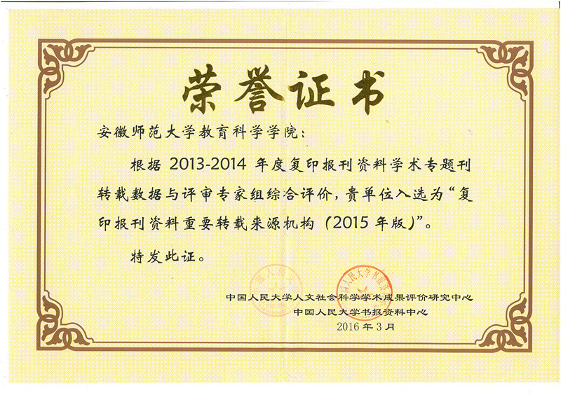 据不完全统计,2011年以来,我院共有26篇学术论文被人大复印资料转载,凸显了学院一贯重视高水平、高质量论文的突出成效。教育学学科已经逐步成为安徽省教育改革与发展的思想库、信息库和人才库,汇聚和培养了服务本省教育改革和发展的教育研究人才,在国内已有较大影响、在同类院校中居于领先地位,具有较为鲜明研究特色和优势领域。
