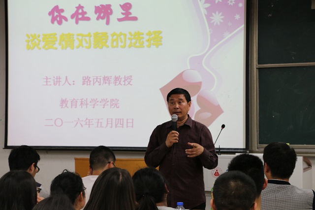 本网讯(教科院 莫大贡)为更好的引导青年大学生理性面对爱情,走好人生之路,5月4日晚,在五四青年节到来之际,我院邀请全国师德标兵、安徽省十大教育人物、“丙辉漫谈”主讲人路丙辉教授与青年学生共话爱情。2015级教育学、心理学、应用心理学等5个专业的同学参加了本次漫谈,漫谈由2015级辅导员莫大贡主持。
