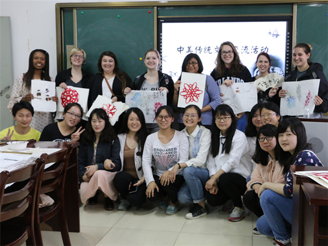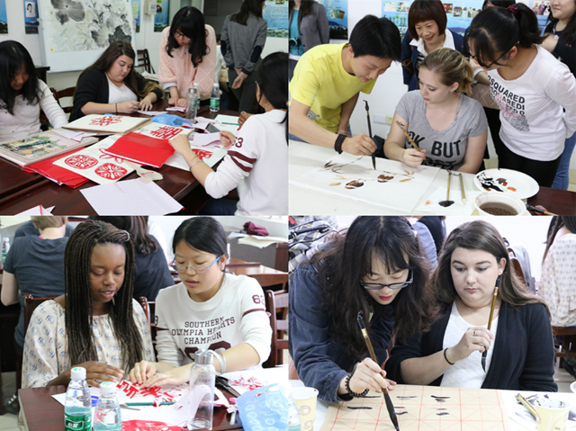当天下午在学院412活动室,院团委学生会组织开展了一场别开生面的中华传统文化交流活动。14级教育学黄涛同学、13级学前教育学张玉婷同学以及14学前教育专业的黄娴瑾、翟梦婷、赵静文、金燕雯等同学向美方师生展示并教授了国画、书法和剪纸的创作。