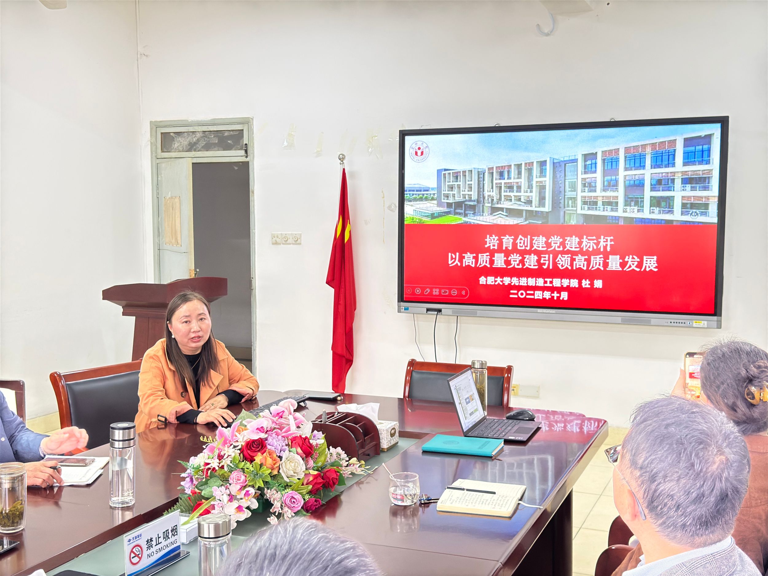 会议邀请合肥大学先进制造工程学院党委书记杜娟做了题为《培育创建党建标杆 以高质量党建促进高质量发展》的关于双创申报工作的辅导报告,从学院的发展、党建的特色以及个人的思考等角度进行了深入的阐述。她强调了党建工作对于学院发展的重要性,并提出了一系列加强和创新党建工作的措施,旨在全面提升教育教学质量和培养高素质人才,从而支撑学院的高质量发展。杜娟回顾了学院自2003年以来在借鉴德国模式基础上的人才培养模式改革,以及在国家级和省级教学成果上的成就。她还提到,通过“四坚持、四聚焦”战略,学院不断提升人才培养质量,并与事业发展深度融合,以高质量党建引领学院高质量发展。