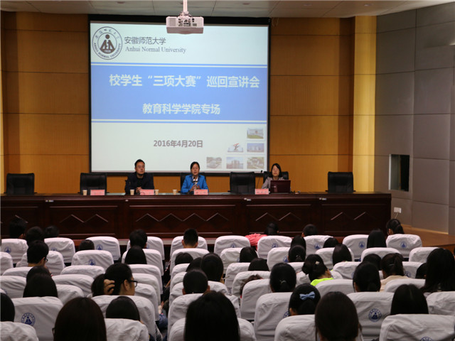 本网讯(教科院 代青清)为了提高学生的科研能力,培养学生的创新精神,教科院于2016年4月20日下午4点,在田楼报告厅举办校学生“三项大赛”为主题的宣讲会。宣讲会邀请了校科研处沈炎老师、姚莉莉老师和学前教育专业的徐赟博士。院党委副书记张如华、2015级辅导员莫大贡以及2014级和2015级心理学、应用心理学和学前教育全体学生参加了本次会议。会议由张如华主持。