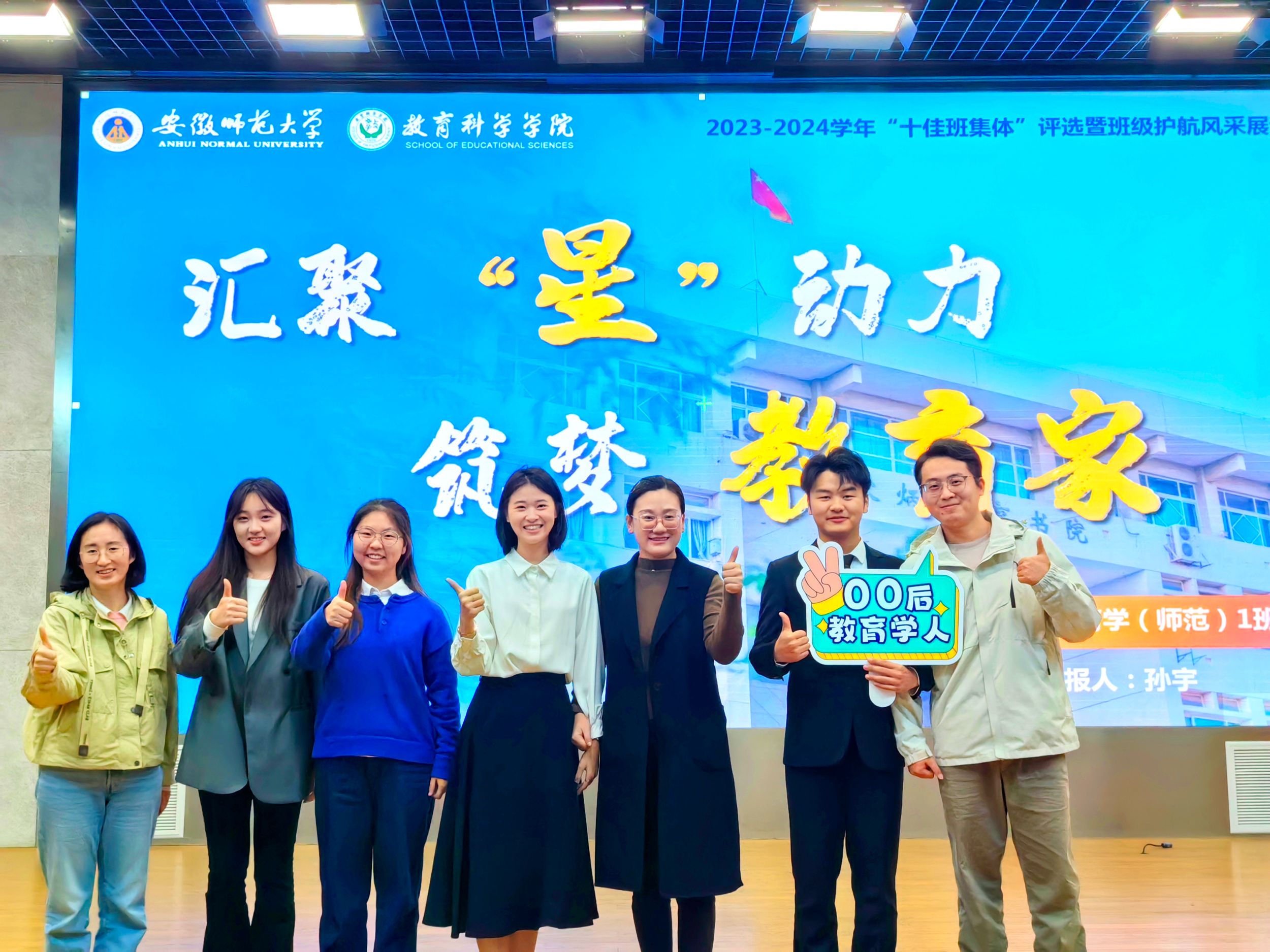 10月30日下午,安徽师范大学2023-2024学年“十佳班集体”风采展评会在花津校区举行。教育科学学院2021级教育学1班在本次“十佳班集体”评选中以精彩的表现脱颖而出,荣获“十佳班集体”荣誉称号。该班也是继2023年2020级教育技术学1班之后,学院再次获评校“十佳班集体”的班级。