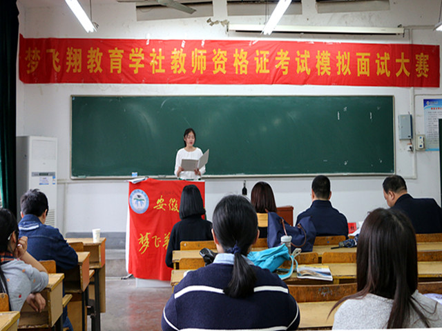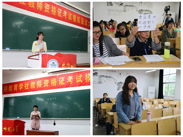 本网讯(教科院 代青清)为响应学校教育思想观念大讨论的号召,加强学生对教师资格考试流程的了解,教科院“梦飞翔”教育学社立足于《国家中长期教育改革和发展规划纲要》文件,结合当今师范学院学生的发展状况,“梦飞翔”教育学社于四月下旬举办了以“师资格证考试”为主题的模拟面试大赛。