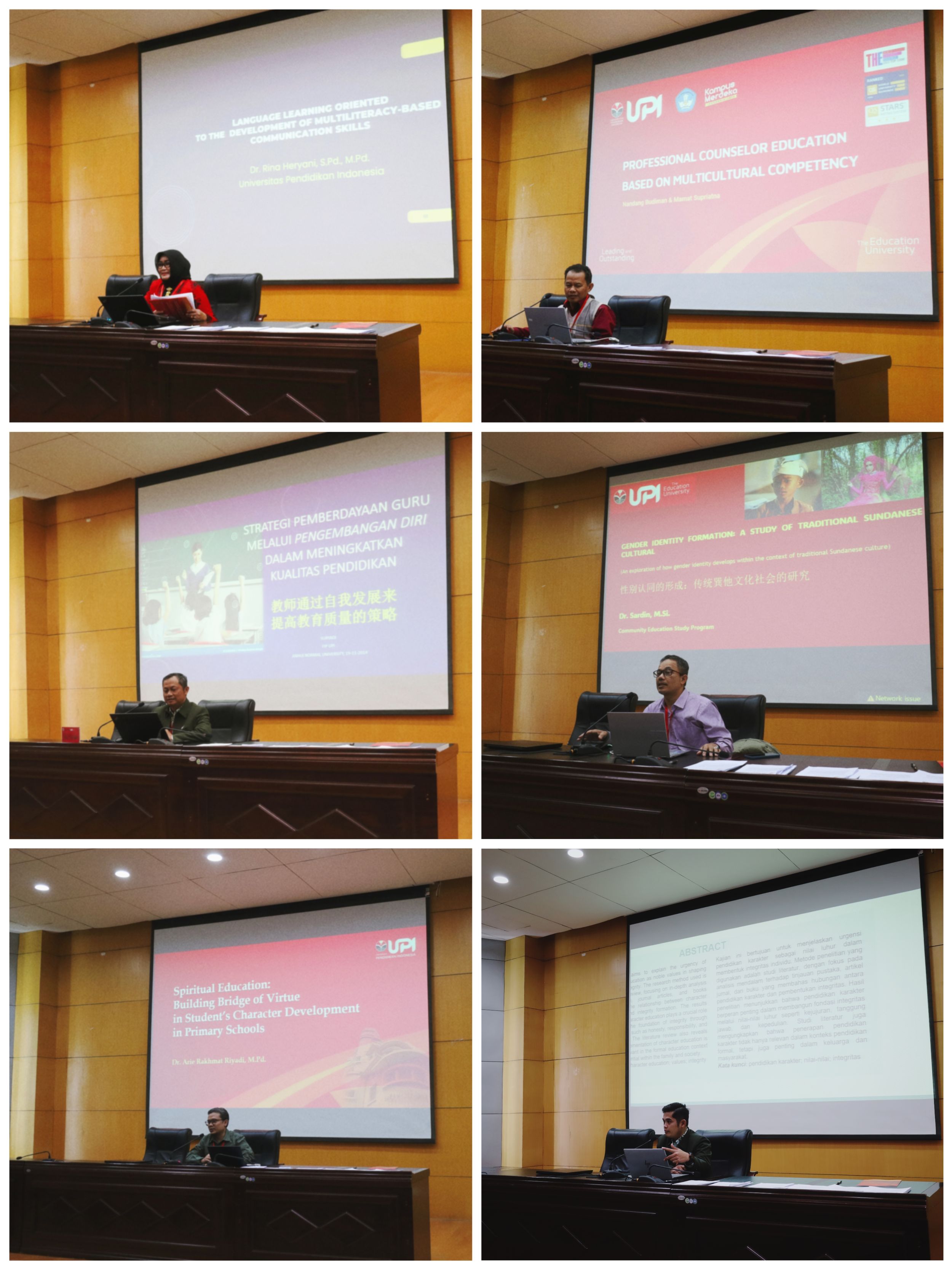 在大会报告环节,鲁迪·苏西拉纳教授首先作题为“提高高等教育机构间学术合作的策略”的主旨报告。紧接着,该校6名博士生分别作题为“基于多元文化能力的咨询师专业教育发展”、“通过自我发展赋能教师以提高教育质量的策略”、“儿童性别认同的形成:巽他文化的人种志研究”、“精神教育:在小学阶段的品德发展中架起美德的桥梁”、“品德教育作为建立诚信的崇高价值”、“基于多元识字的语言学习与沟通能力的发展”的学术报告。