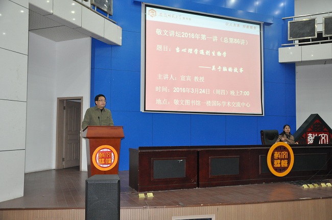 本网讯 3月24日晚,敬文讲坛2016年第一讲(总第86讲)在敬文图书馆一楼国际学术交流中心如期开讲。讲坛邀请到我院心理学专业宣宾教授,做了题为“当心理学遇到生物学——关于脑的故事”的专题讲座,讲座由图书馆馆长方青教授主持。图书馆党总支书记程文海和广大师生一起聆听了本次讲座。