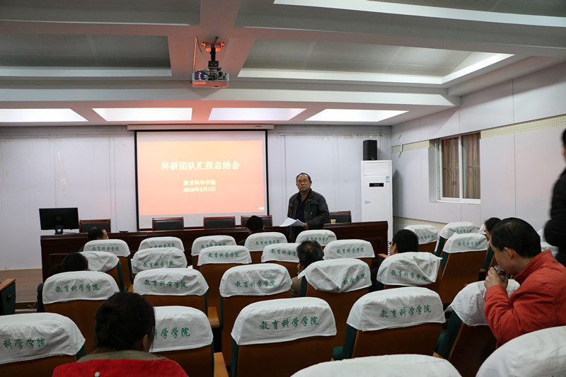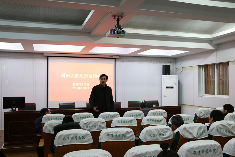 本网讯(教科院 孟庆娟)一年之计在于春。按照学院【2015】9号文“教育科学学院科研团队组建、运行和绩效考核办法(试行)”和【2015】11号文“关于组建教育科学学院科研团队(首批)的通知”,3月2日下午,学院在三楼学术交流中心召开2015年度科研团队汇报总结会。院长桑青松,副院长李宜江、聂竹明,教授委员会全体成员、各团队负责人及骨干成员参加了汇报会。汇报会由教授委员会主任周兴国教授主持。